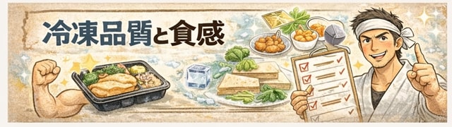 | 冷凍品質 | 解凍後の状態を想定し、高タンパク食でも食感が損なわれにくい冷凍弁当かを見極めます。 |