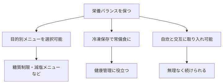 栄養バランス | カロリー・塩分・糖質・タンパク質の調整 | 健康管理やダイエット目的に合っているか |